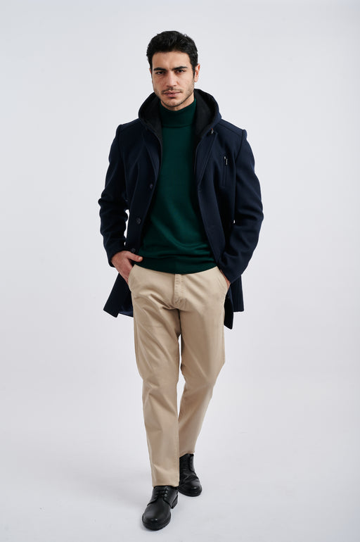 View full detailsDescription:This is a men’s mid-length winter coat designed in a classic, elegant style. It features a dark navy color, a front button closure with...