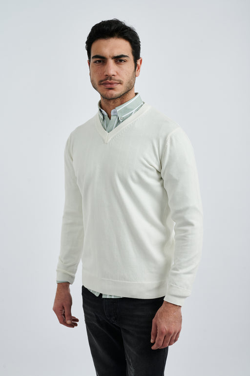 View full detailsDescription:This is a men's long-sleeve V-neck sweater in an off-white/cream color. It features a clean, minimal design with ribbed cuffs and hem f...
