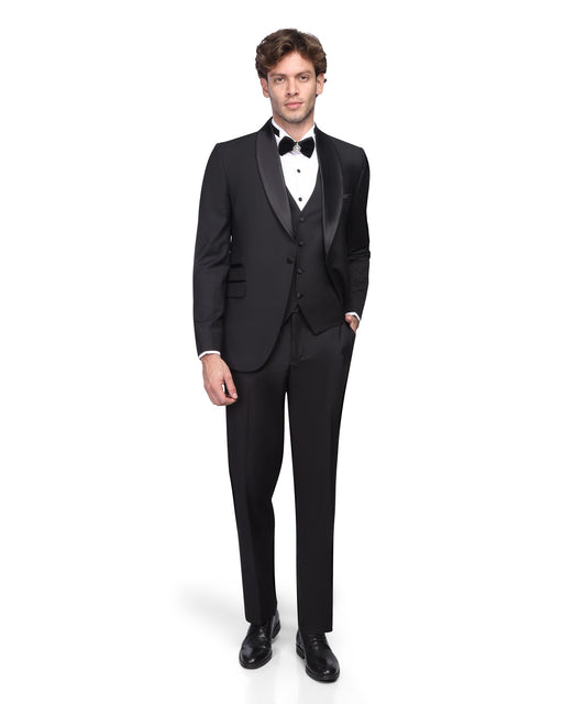 View full detailsDescription:The displayed outfit is a Formal Evening Suit, specifically a tuxedo, composed of three pieces: the jacket, the waistcoat (vest), and t...