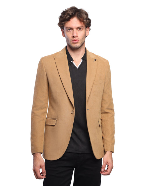 View full detailsDescription:A Camel Blazer with a suede-like texture and a slim fit. It features a classic notch lapel and is styled for a smart casual or business...