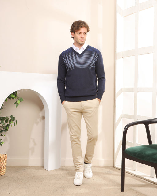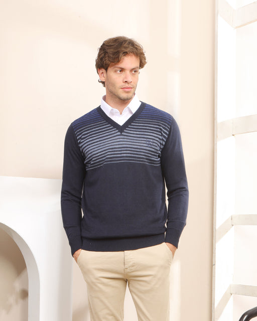 View full detailsDescriptionThis is a men’s navy V-neck sweater designed with a clean, modern look. The upper chest area features horizontal gradient stripes in lig...