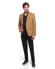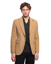 A Camel Blazer with a suede-like texture and a slim fit. It features a classic notch lapel and is styled for a smart casual or business casual look.