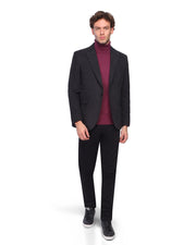A Black Blazer with a suede-like texture and a slim fit. It features a classic notch lapel and is styled for a smart casual or business casual look.