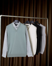 This timeless sleeveless knit vest showcases a refined V-neck silhouette with understated elegance. Designed for versatility, it layers seamlessly over dress shirts to create polished, professional ensembles or pairs effortlessly with casual basics for relaxed sophistication. The reinforced ribbed edging provides structural integrity while delivering a tailored, secure fit that maintains its shape through regular wear.