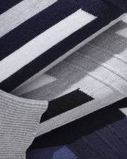 Modern striped design in white, navy, and gray